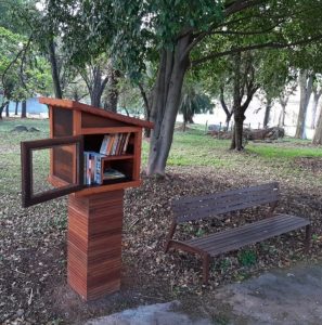 Uma moradora de Alto dos Pinheiros viu algo assim numa viagem à Bretanha (noroeste da França). Adorou. De volta ao Brasil, convenceu o marido (um engenheiro francês com jeito para marcenaria) a construir uma casinha. A peça foi feita com material reciclado e instalada na praça Japubá, em fevereiro de 2018 (foto à esquerda). A divulgação se deu por meio de panfletos na vizinhança e posts no Facebook.