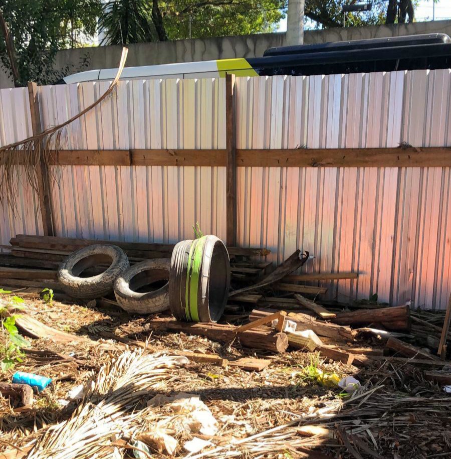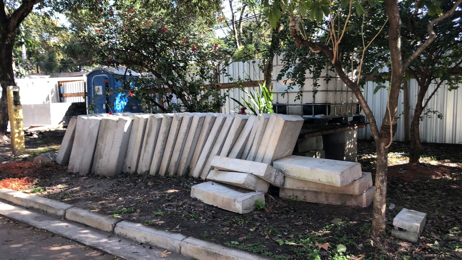 - Vegetação afetada: Material de obra e tapumes continuam espalhados pelo canteiro central da avenida, com vegetação inteiramente danificada.